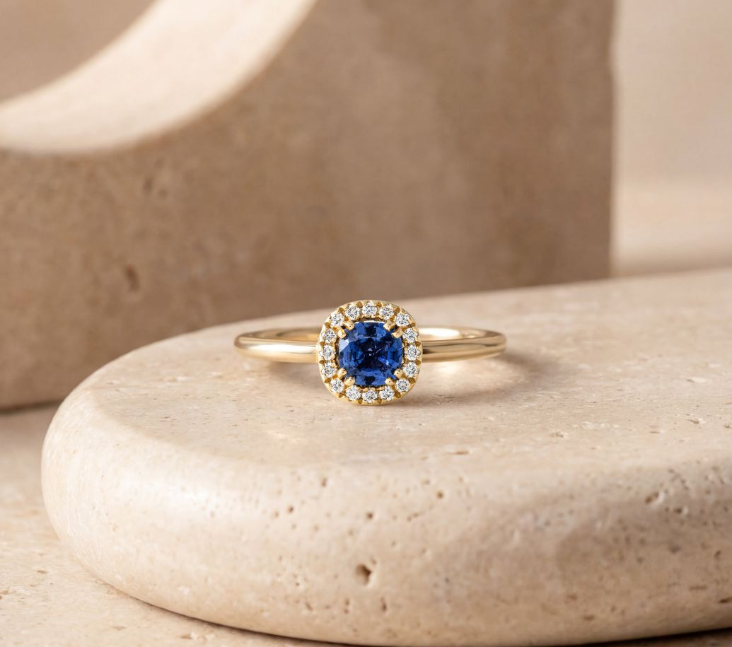 The Jolie-Rose solitaire highlights a blue sapphire of remarkable intensity. Its round cut reveals a livelier, almost vibrant play of light that immediately draws the eye. The surrounding diamonds add subtle points of brilliance, enhancing the color without overpowering it. They accompany the central stone with finesse, creating a light, delicate rhythm. The fine gold band remains discreet, allowing the sapphire to fully express itself. The balance feels natural and effortless. A ring designed to last, embodying a sincere elegance — ideal for those seeking a blue sapphire that is both luminous and confidently expressive.