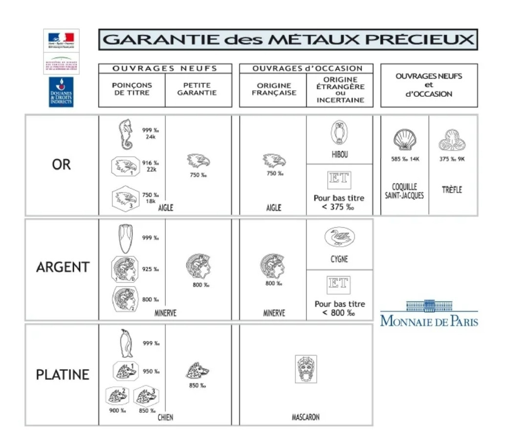 In France, hallmarks are strictly regulated by the Direction Générale des Douanes et de l'Espace (Directorate-General of Customs and Exports). Their appearance is mandatory for the following items:
