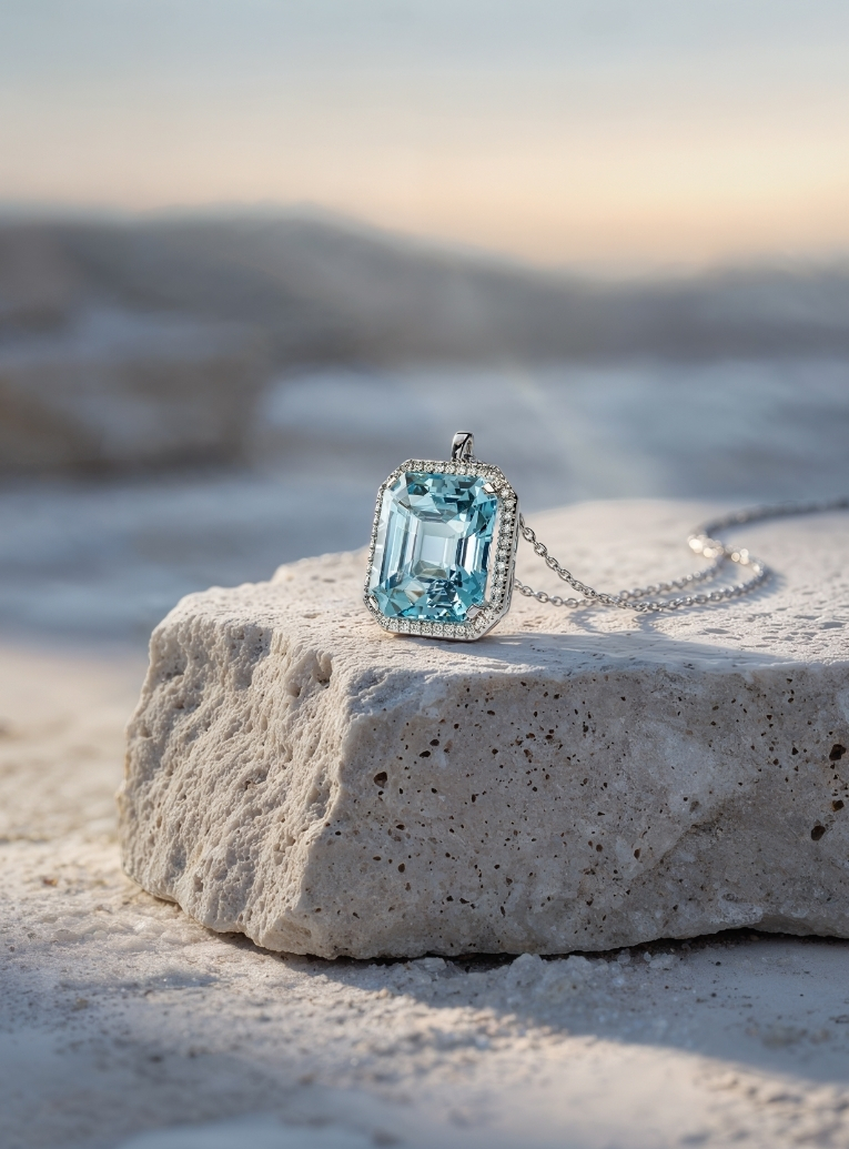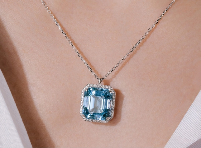 At the heart of this necklace, an 11-carat Santa Maria aquamarine unfolds a deep, limpid blue, like a fragment of a newborn sky. Its clean, structured cut allows light to move freely through the stone, revealing nuances that shift from soft to radiant. Surrounding it, a delicate halo of diamonds enhances its brilliance without ever overpowering it. White gold extends this sense of clarity—pure and luminous, it supports the stone with discretion and precision, creating a perfect balance between presence and lightness.