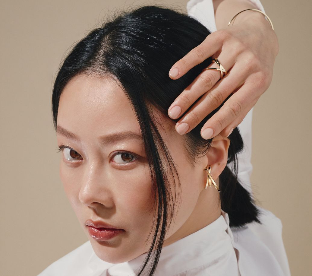 Sur l’oreille, les anneaux d’or entrelacés dessinent une ligne lumineuse, solaire et captivante.