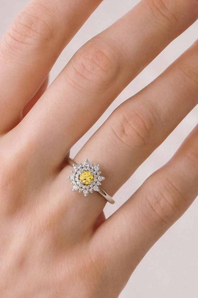 La bague Dentelle révèle ici un saphir jaune à la lumière vive, subtilement entouré de diamants qui en prolongent l’éclat. La pierre diffuse une clarté naturelle, apportant à la main une présence lumineuse et chaleureuse. L’ensemble, finement travaillé, trouve son équilibre dans la justesse des proportions et la délicatesse des reflets. La monture en or accompagne la pierre avec fluidité, laissant la lumière s’exprimer pleinement. Dans l’univers Coquette, cette création évoque une élégance lumineuse, à la fois spontanée et raffinée. Une bague pensée comme une attention précieuse, à offrir pour marquer un moment ou simplement faire plaisir.